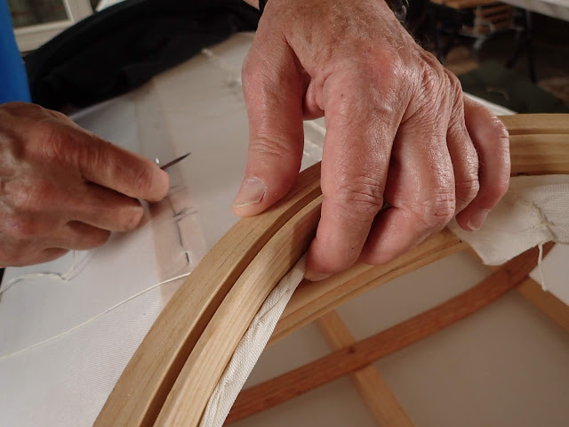 Sewing continued... Here we stitch the cockpit to Martins kayak.